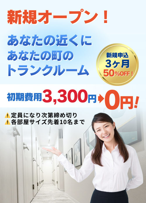 あなたの町のトランクルームが選ばれる理由 徹底した防犯・セキュリティ体制 24時間稼働の高精度防犯カメラに加え、各部屋に個別の鍵を完備しています。地下店舗ならではの「人目が気にならない安心感」と「強固なセキュリティ」を両立。女性お一人や夜間・早朝の出し入れも、常に安全が守られた環境でご利用いただけます。 オープン3ヶ月!地域No.1級の清潔感 2025年冬にオープンしたばかりの新築同様の店舗です。従来の暗い・汚い・不気味というイメージを覆す、白を基調とした明るくクリーンな内装が自慢です。大切な衣類や思い出の品も、ホコリや汚れを気にせず、自宅のクローゼット感覚で保管いただけます。 雨の日もスムーズ搬入 専用駐車場はありませんが、店舗の目の前に一時停車しての積み下ろしが可能です。路面から地下1階の店舗まで最短距離でアクセスできるため、キャンプ道具やタイヤ、大型家具などの重い荷物もお車からスムーズに運び込めます。 24時間365日いつでも出し入れ自由 早朝のレジャー出発前や、深夜の急な片付けなど、お客様のライフスタイルに合わせて24時間いつでもご利用いただけます。面倒な予約や立ち会いは一切不要。スマートなセルフ運営により、お客様の今すぐ使いたいにいつでもお応えします。 初期費用3,300円のみ!圧倒的な安さ 事務手数料や管理費などの不透明な追加費用をカットしました。当店の初期費用は、鍵交換代と事務手数料を合わせた3,300円(税込)のみ。初月の月額料金以外に余計なコストがかからないため、気軽に、もう一つの収納をスタートできます。 地下店舗ならではの安定した保管環境 完全屋内かつ地下に位置しているため、屋外コンテナのような急激な温度変化や直射日光による劣化の心配がありません。湿気や日焼けに弱いデリケートな荷物の保管にも最適。高品質な環境を、管理工夫により地域最安値クラスで提供しています。 type トランクルームの種類 Aタイプ【0.5畳】 小さな荷物に最適 書類や季節物の衣類など、ちょっとした荷物の保管に便利です。 Bタイプ【1畳】 1人分の収納にぴったり 家庭の収納不足や一人暮らしの荷物をまとめて保管できます。 Cタイプ【2畳】 家族分の荷物も収納可能 家具や家電も入る広めサイズで、引越しや長期保管にも対応。 System 料金システム・空き状況 No 空き状況 広さ(表示面積) サイズ 料金(税込) 1 〇予約する 1.2㎡ 約.07畳 奥行1.1m×幅0.7m+幅0.5m×奥行0.9m 13,200円/月 2 〇予約する 2㎡ 約1畳 奥行1.7m×幅1.0m×高さ2.4m 22,000 円/月 3 〇予約する 4㎡ 約2畳 奥行1.6m×幅2.6m×高さ2.4m 38,500円/月 Flow 申し込みは簡単3ステップ 1お問い合わせ・空室確認 LINE公式アカウント・お電話(0369134490)にて空室状況を確認できます。 2契約手続き オンラインOK!必要書類を揃えて簡単に契約可能。 3ご利用開始 契約後、鍵を受け取ってすぐに荷物を預けられます。 Q&A よくあるご質問 契約は短期でも可能ですか? はい、3 か月単位から契約可能です。必要な期間だけ利用できるので無駄がありません。 24時間出し入れできますか? 可能です。セキュリティカメラ完備で夜間でも安心してご利用いただけます。 専用駐車場はありますか? 申し訳ありません。専用駐車場はございません。 店内は明るいですか? はい、女性でもお1人で来店いただけますように、明るく清潔な店内にしております。 荷物の搬入・搬出は手伝ってもらえますか? セルフサービスとなります。 契約に必要な書類は何ですか? 身分証明書(運転免許証・マイナンバーカードなど)と、場合によっては連帯保証人書類が必要です。 契約を解約したい場合はどうすればいいですか? 解約希望月の前月15日までに連絡連絡をください。 Access アクセス 〒178-0063 東京都練馬区東大泉2-11-26 パーソナルハイツ B1セブン-イレブン 練馬東大泉NTTビル店さん並びTEL:03-6913-4490